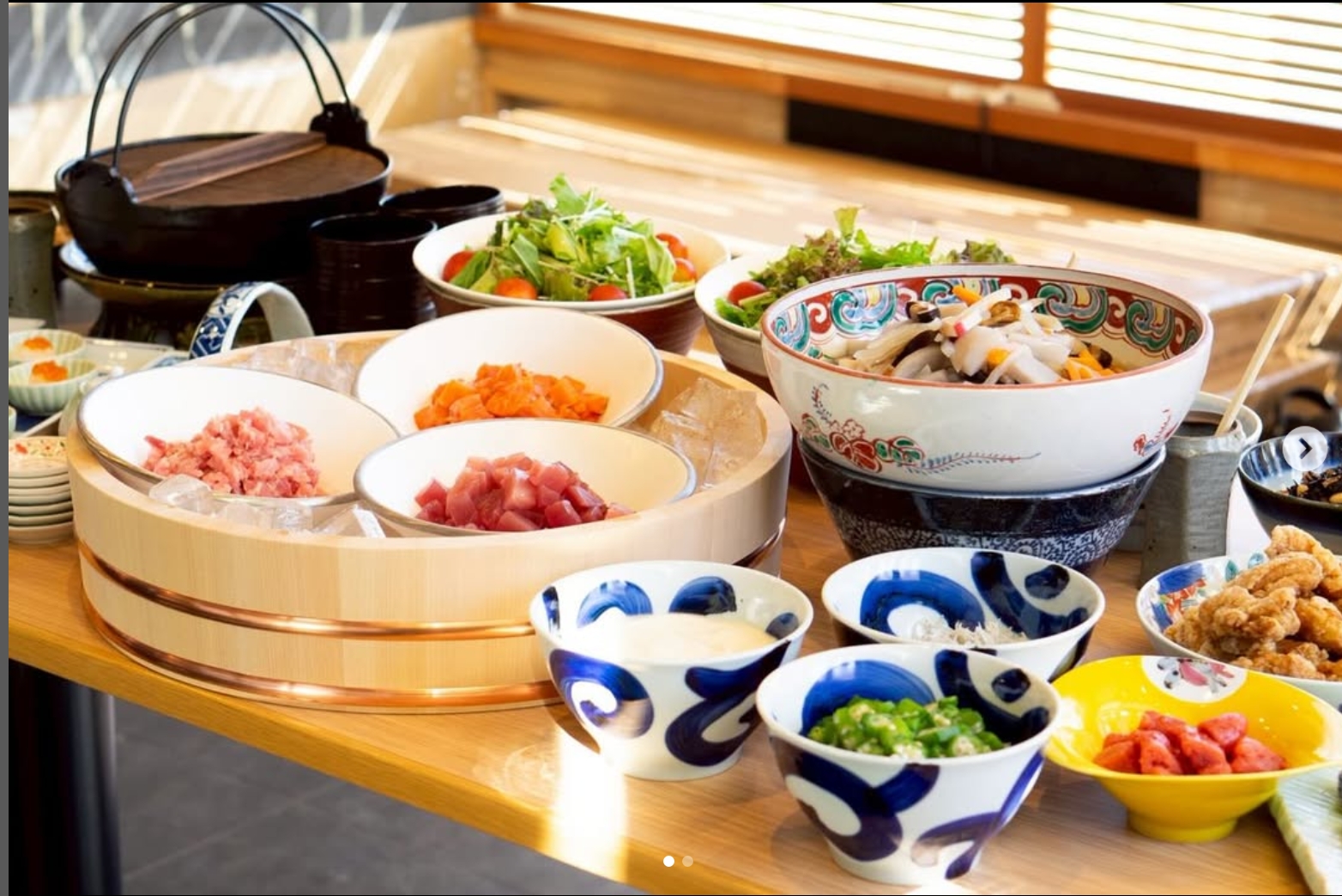 ホテル1階の和食店で和食ビュッフェの朝食、丼2種類のランチを提供しています。